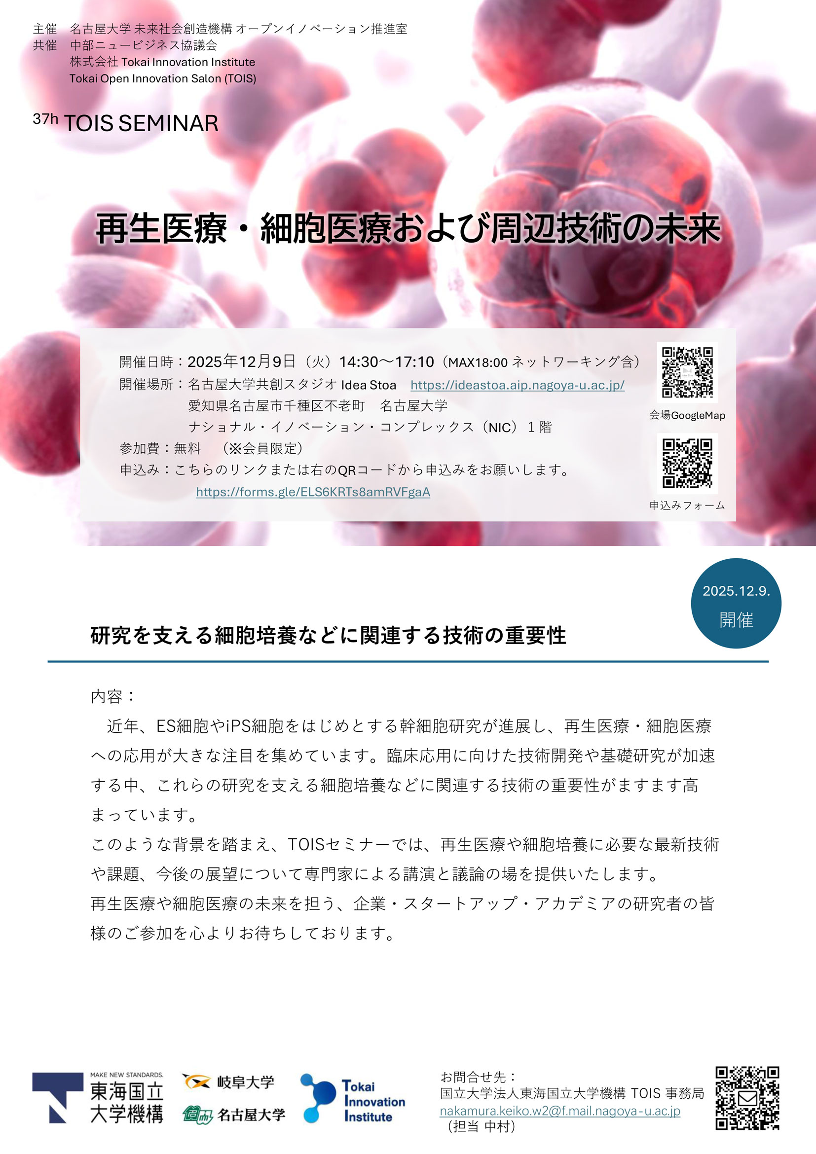 【CNB】12/9 名古屋大学アカデミア・スタートアップとの交流イベント~Tokai Innovation Instituteと細胞培養のための器具・設備を考える~