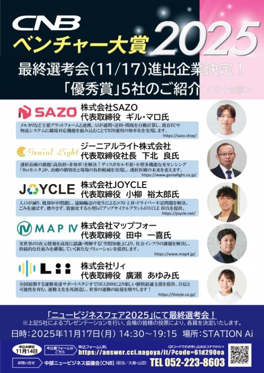 CNBベンチャー大賞 (最終選考に残った優秀賞5社によるプレゼンテーション) ・株式会社 SAZO ・ジーニアルライト株式会社 ・株式会社JOYCLE ・株式会社マップフォー ・株式会社リィ |