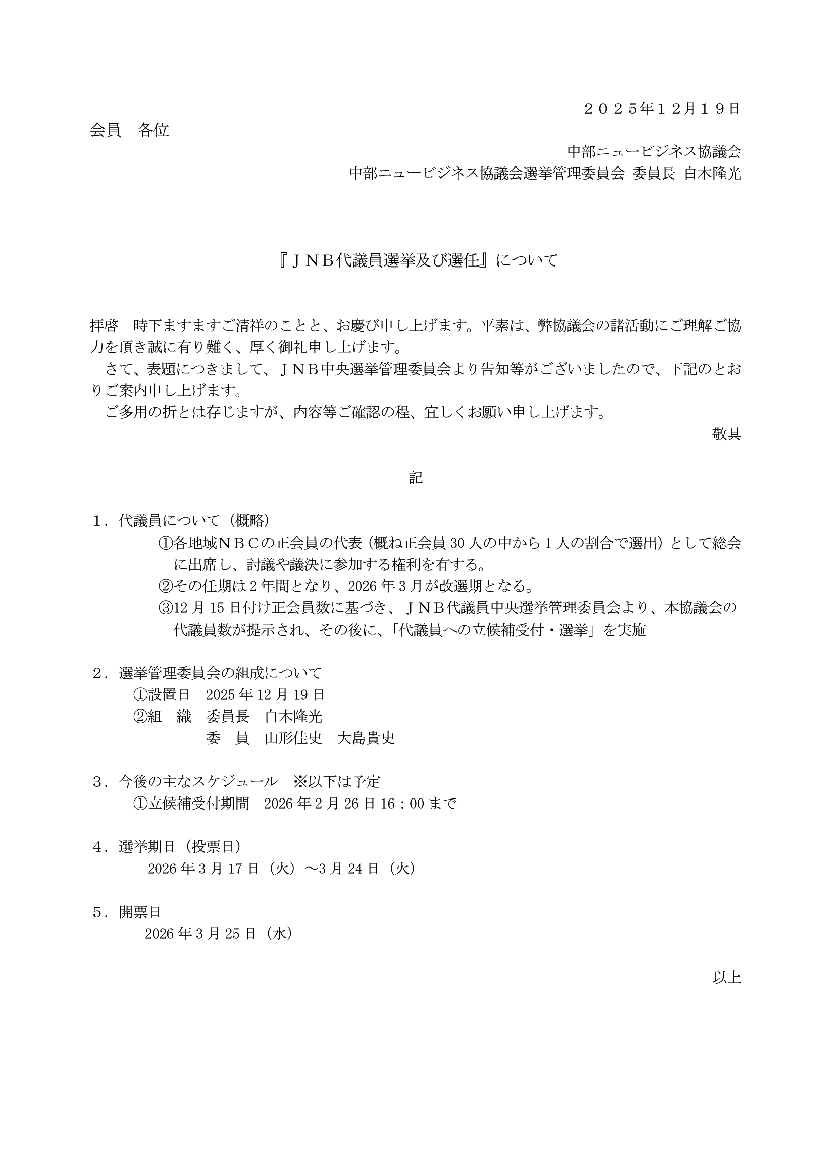 さて、表題につきまして、JNB中央選挙管理委員会より告知等がございましたので、